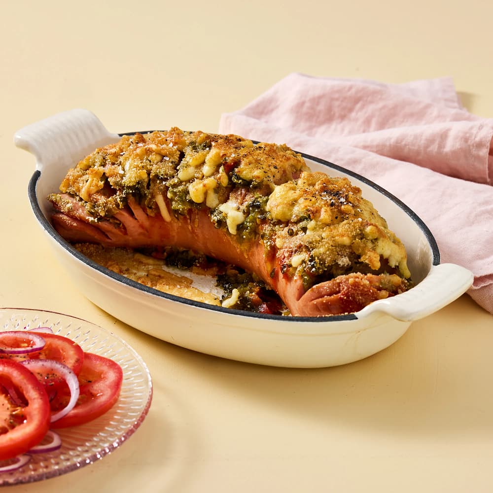 Ugnsbakad falukorv med bostongurka och tomat