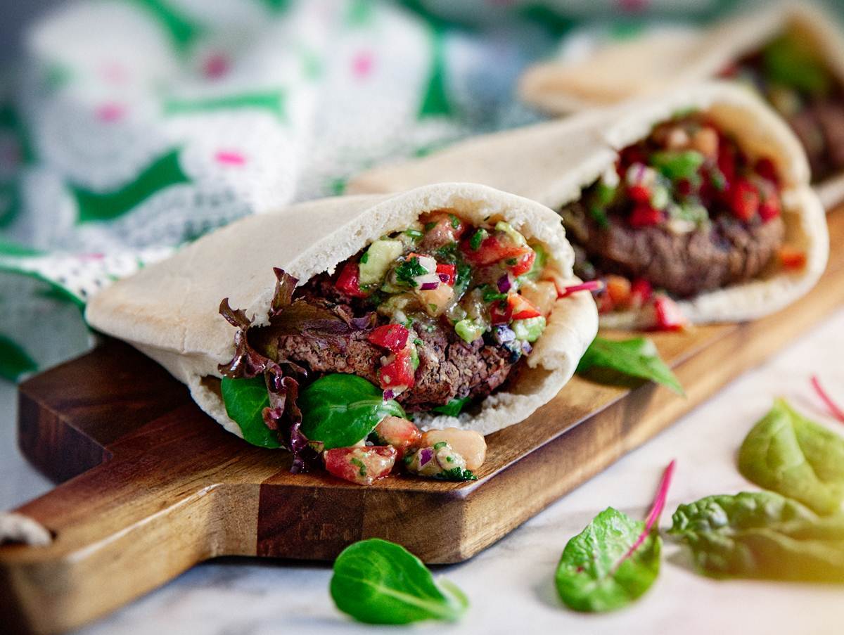 Bönburgare med tomat- och avokadosalsa i pitabröd
