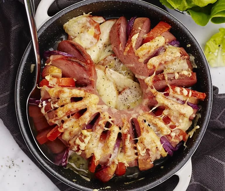 Gratinerade korvstubbar med champinjoner och tomat