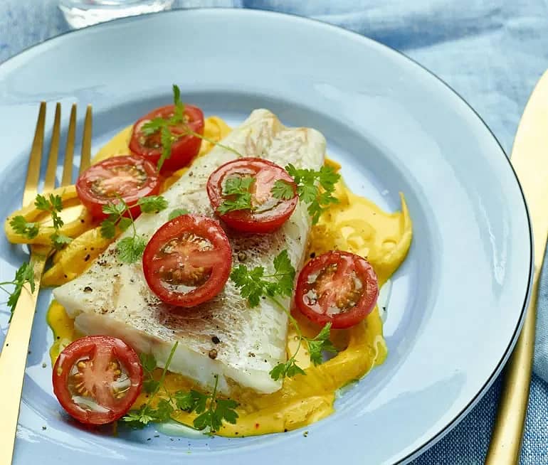 Torsk och krämig fänkål med saffran och tomat