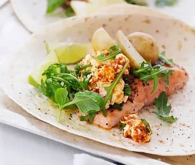 Svartpepparstekt lax i wrap med tomat- och basilikafärskost
