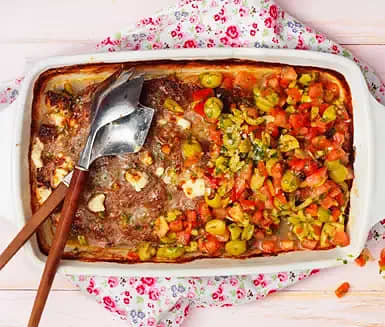 Grekisk färs i form med tomat- och olivsalsa