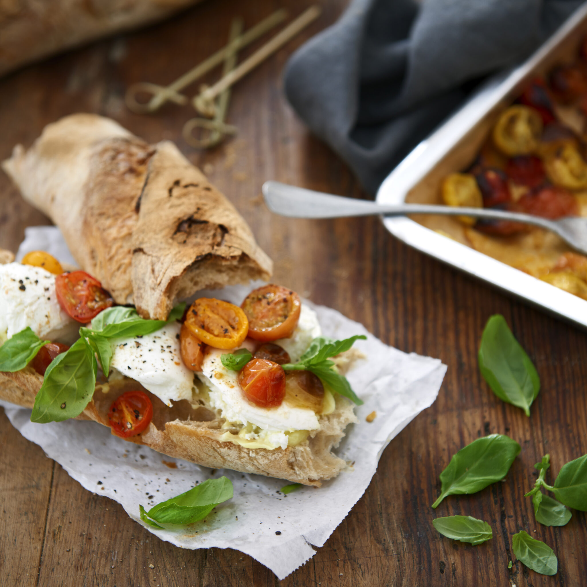 Baguette med mozzarella och ugnsbakade tomater