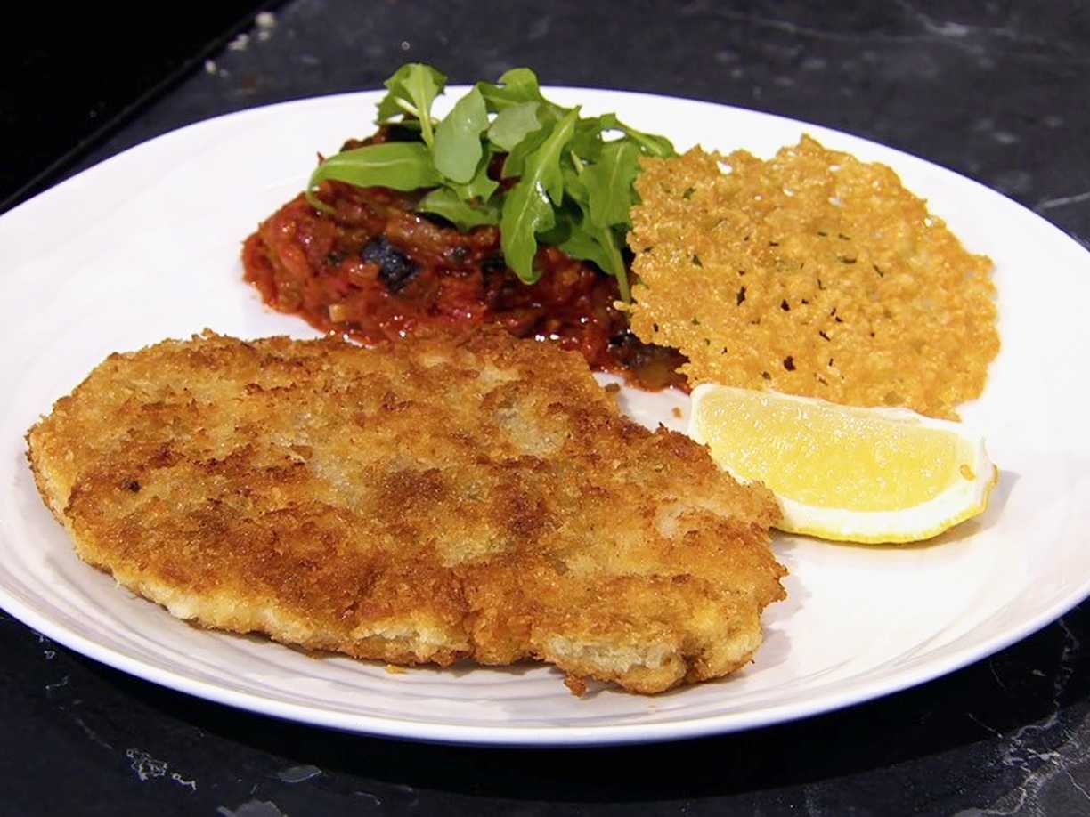 Kyckling milanese med ragu på tomat och aubergine samt parmesanflarn