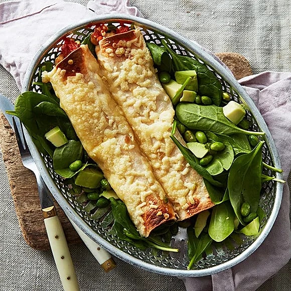 Het wrap med kycklingfilé eller kalkonfilé, chimichurri, tomat och sockerärter
