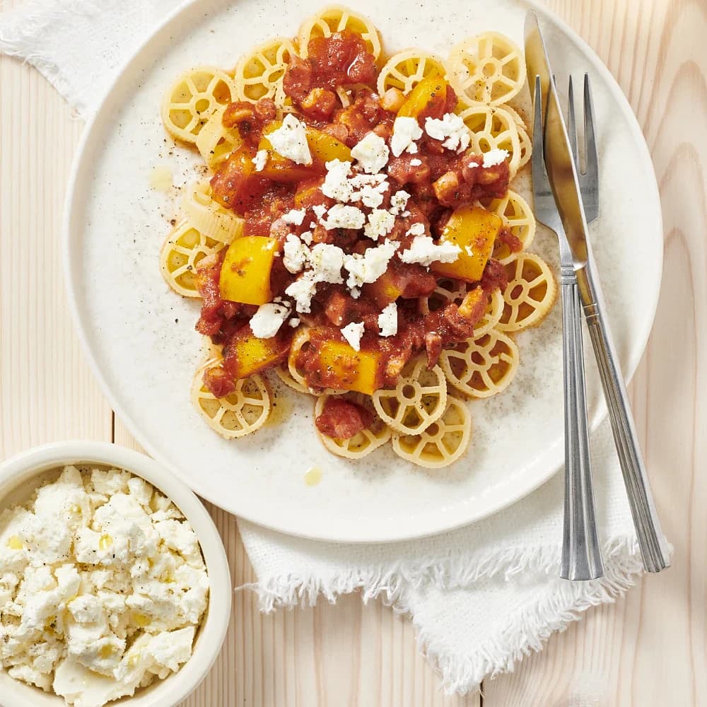 Tagliatelle med tomat- och basilikasås och pinjenötter