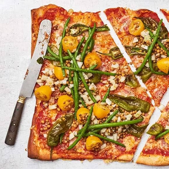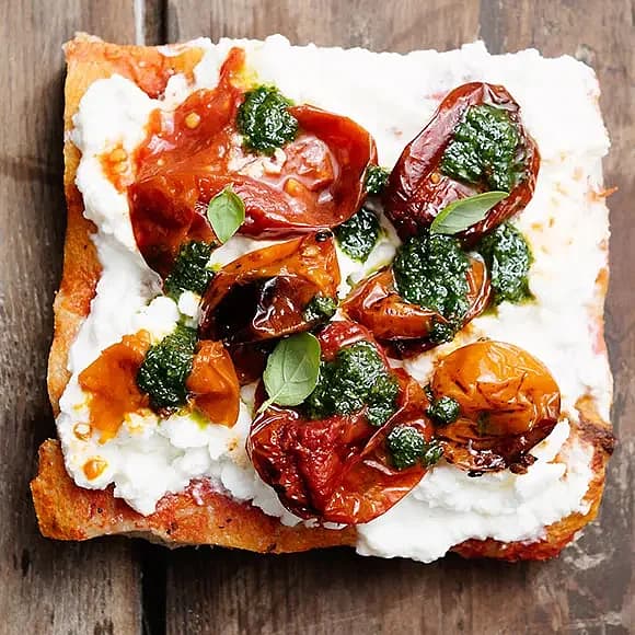 Pizza bianca med soltorkade tomater, vitost och rödlök