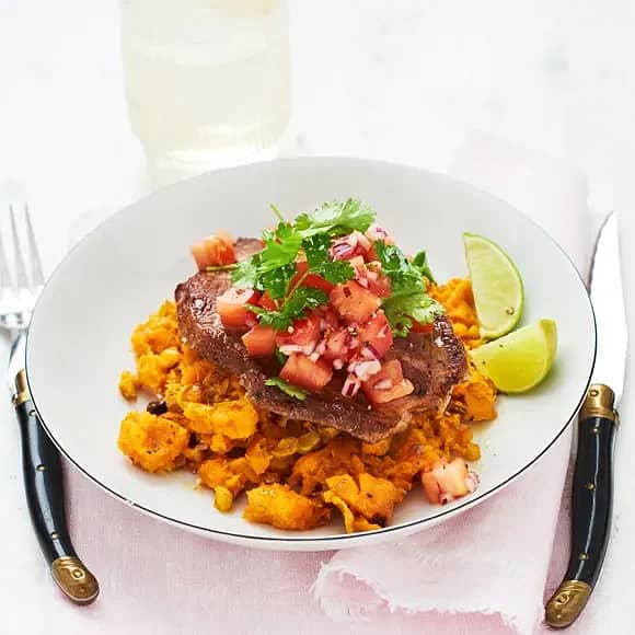 Vitlöksstekt karré med krossad sötpotatis och tomatsalsa