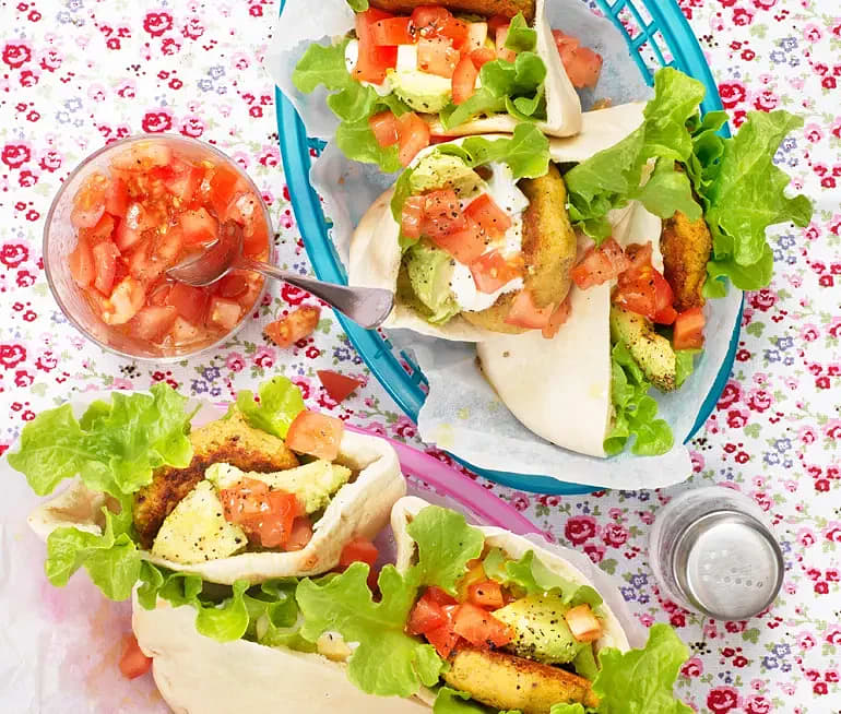 Veggiebitar i pitabröd med fetaoströra och tomatsalsa