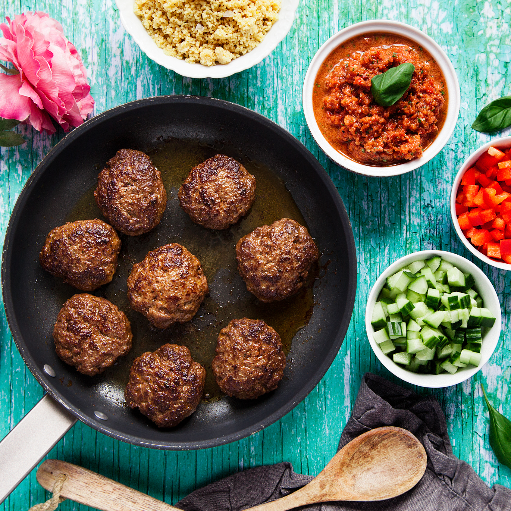 Nötfärsbiffar med frisk tomatsalsa, couscous och grönsaksplock