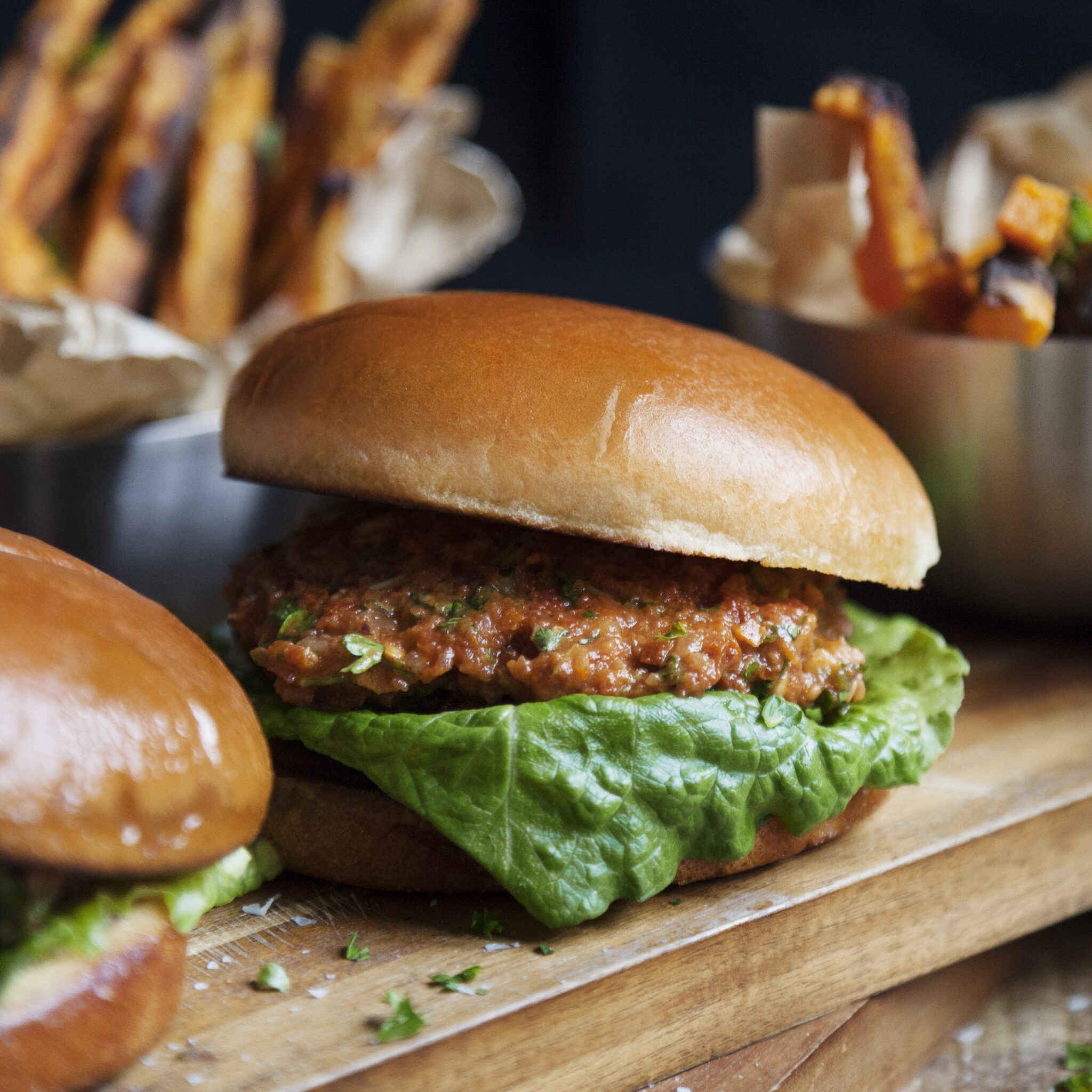 Hamburgare med tomatsalsa och rostad sötpotatis