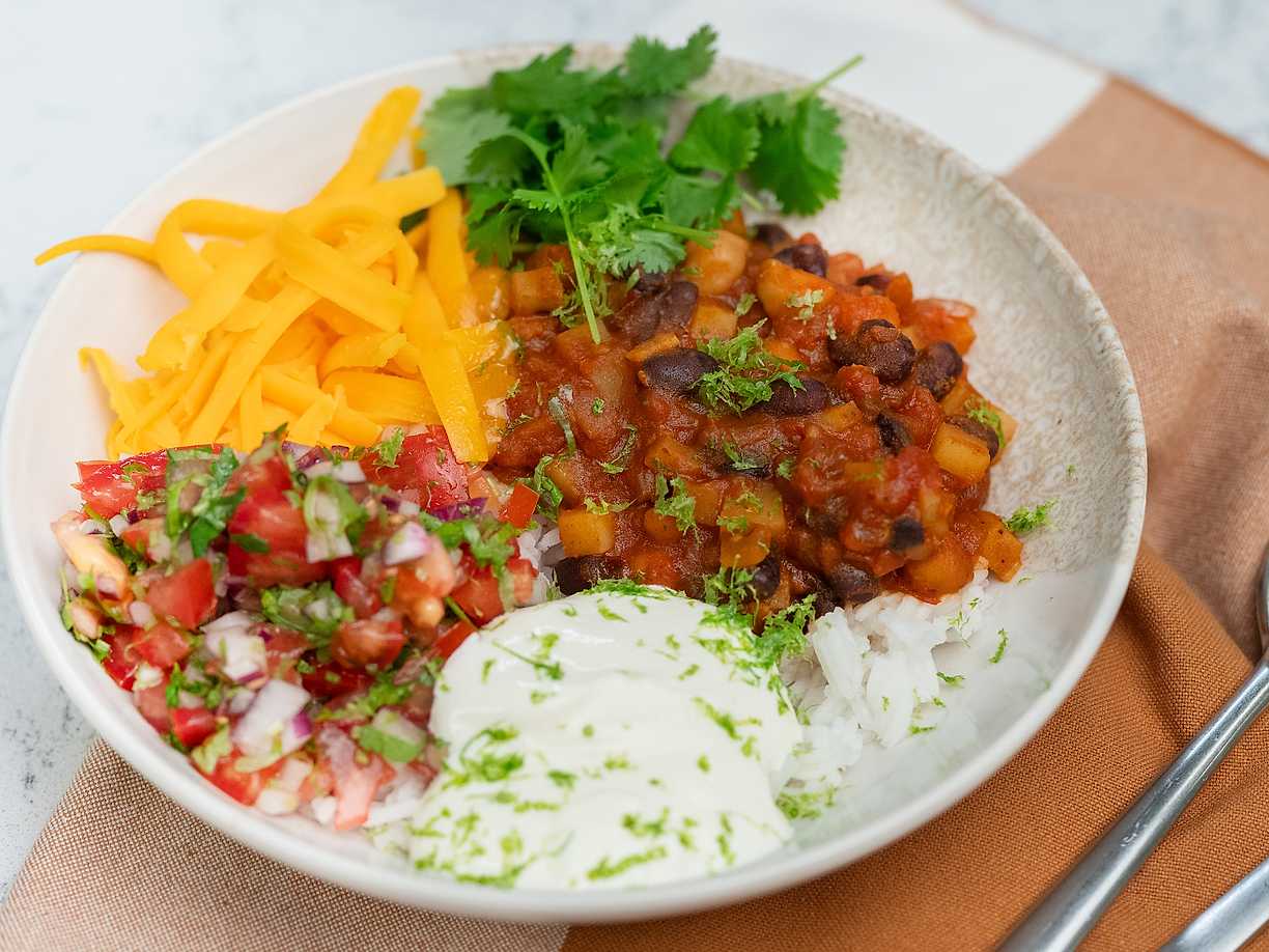 Tex mex-gryta med cheddar, ris och tomatsalsa
