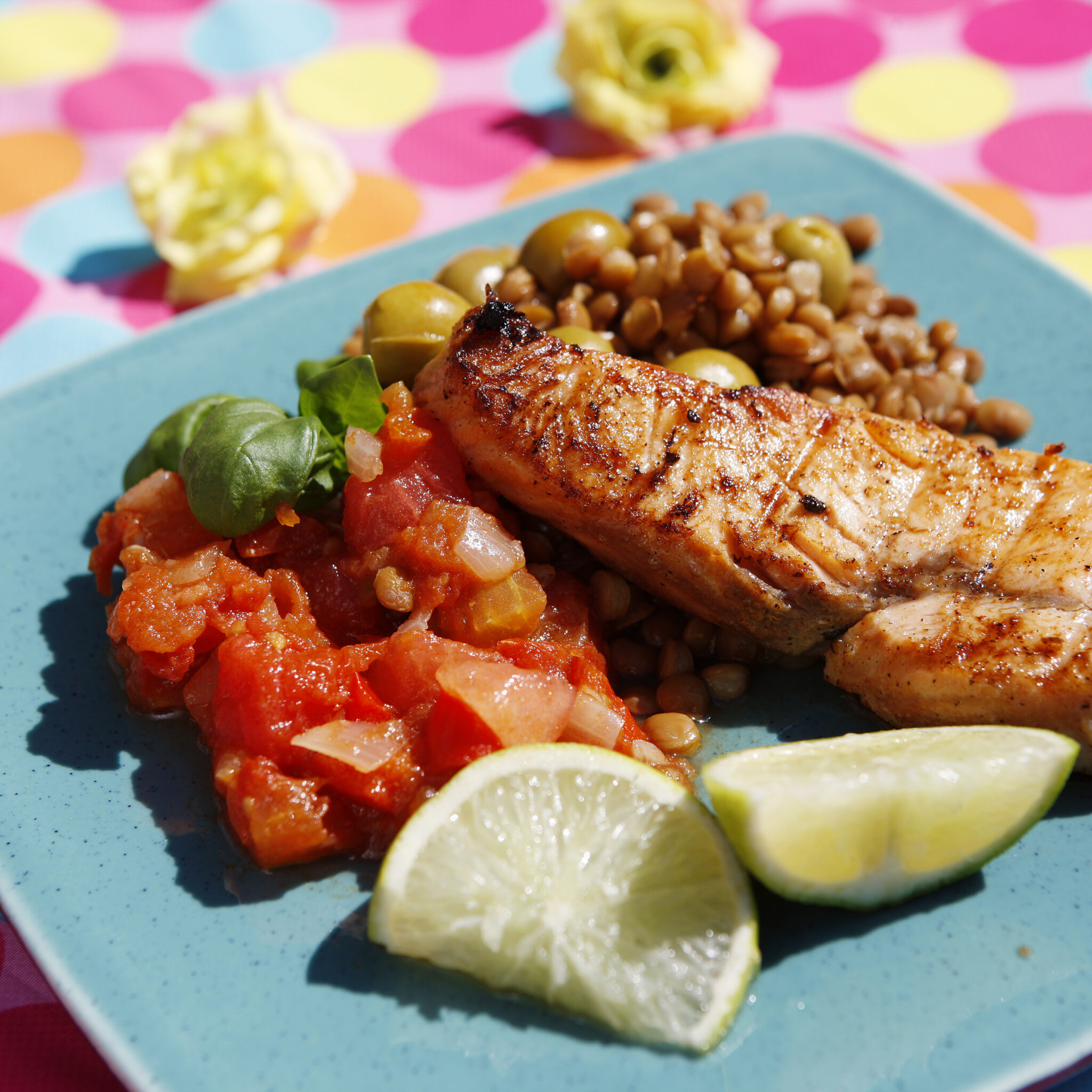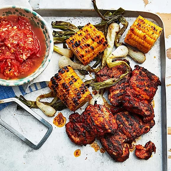 Grillad kycklinglårfilé med rostad tomatsalsa