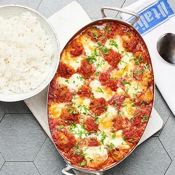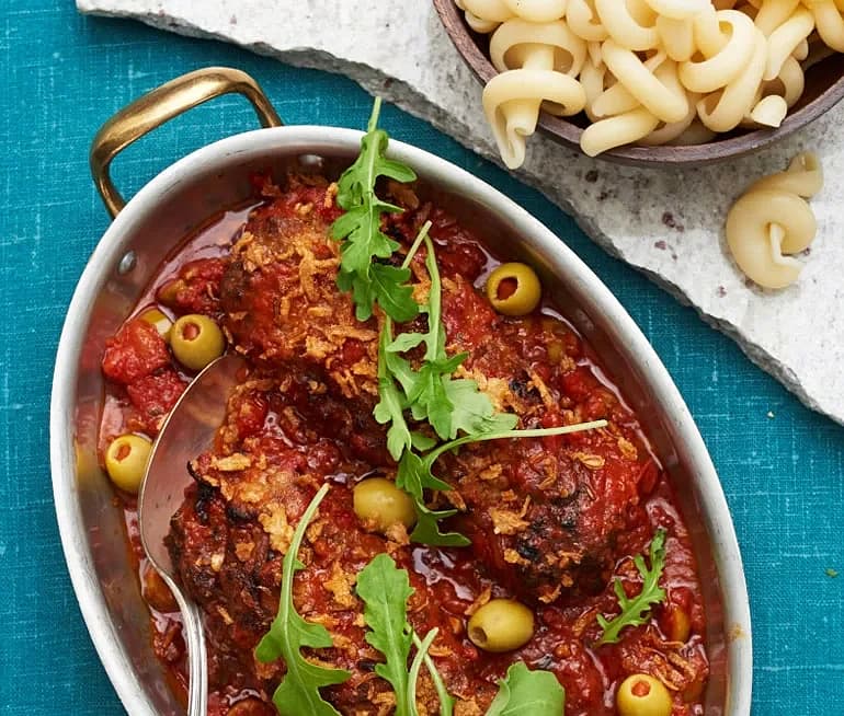 Kycklingfrikadeller i mustig tomatsås