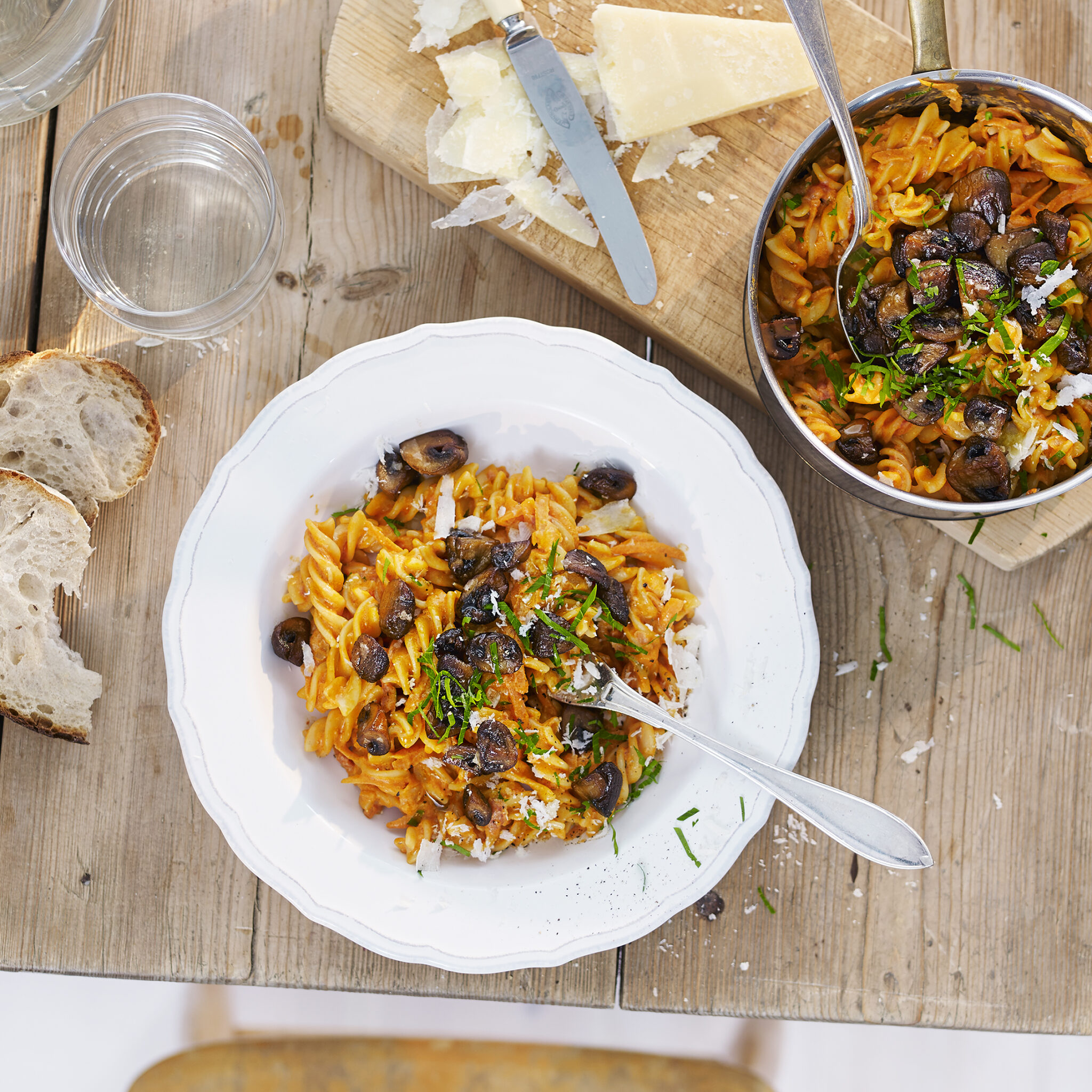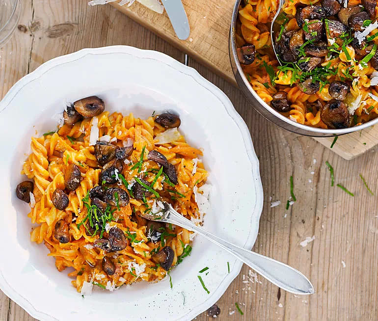 Barilla Fusilli pasta med en krämig tomatsås med svamp
