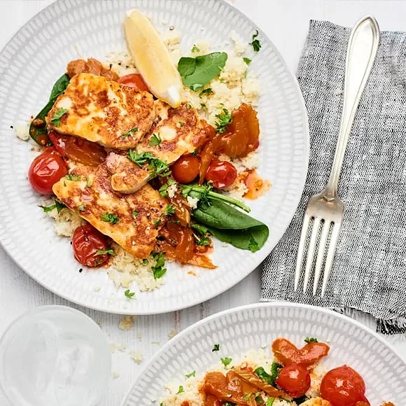 Blomkålstabbouleh med halloumispett och tomatsås