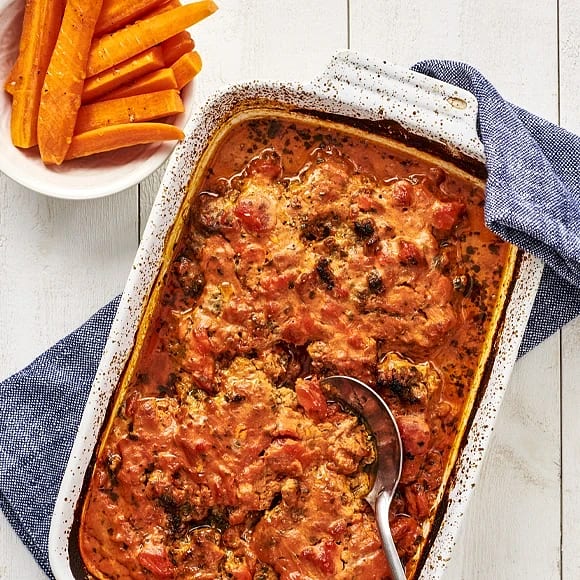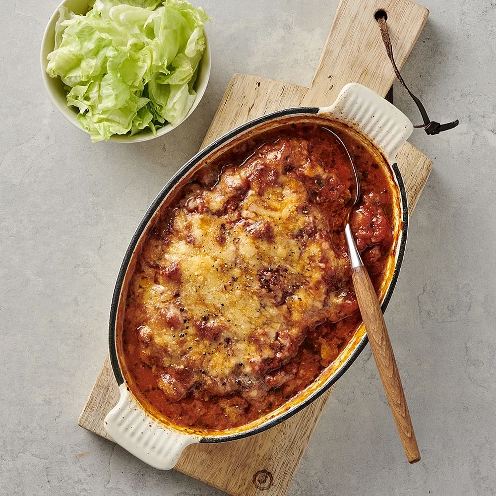Ostgratinerad jättebiff i tomatsås