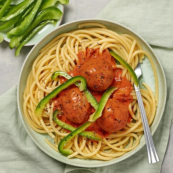 Ugnsbakade köttbullar i tomatsås med spaghetti