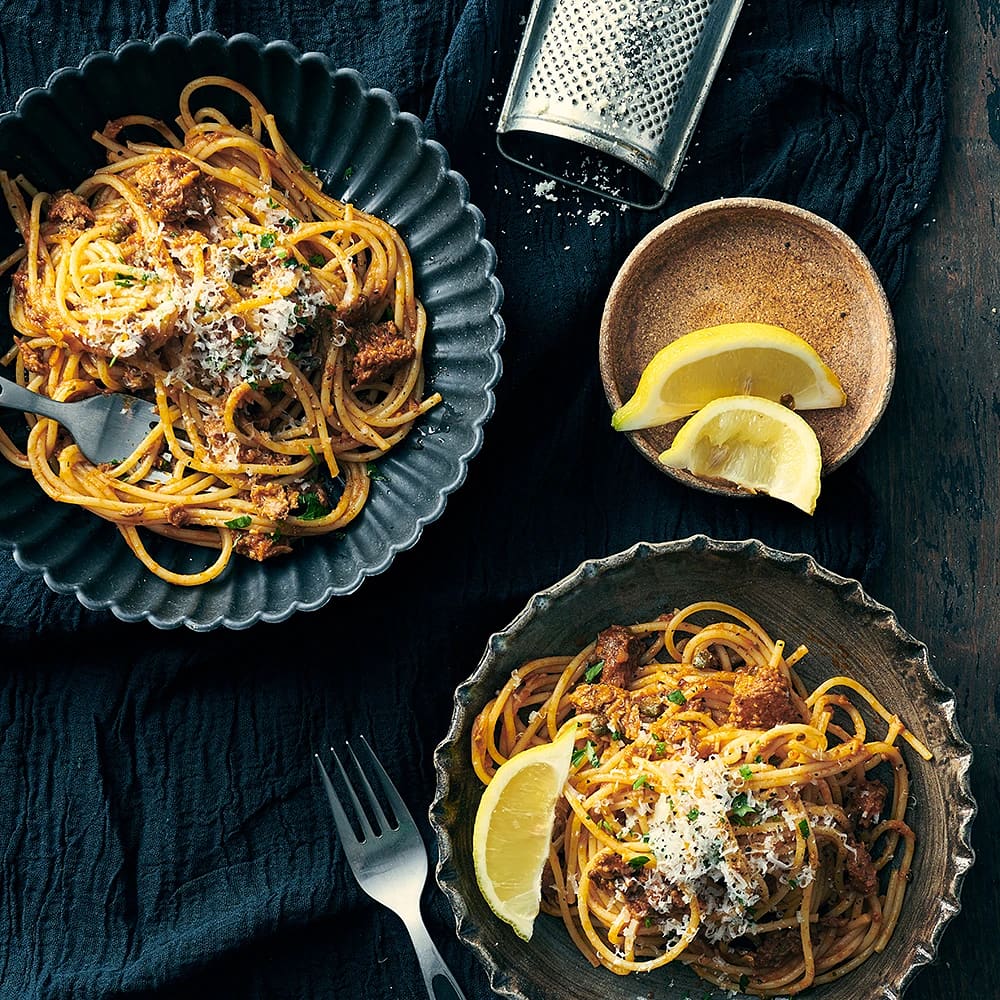 Pasta med rostad tomatsås och stekt kapris