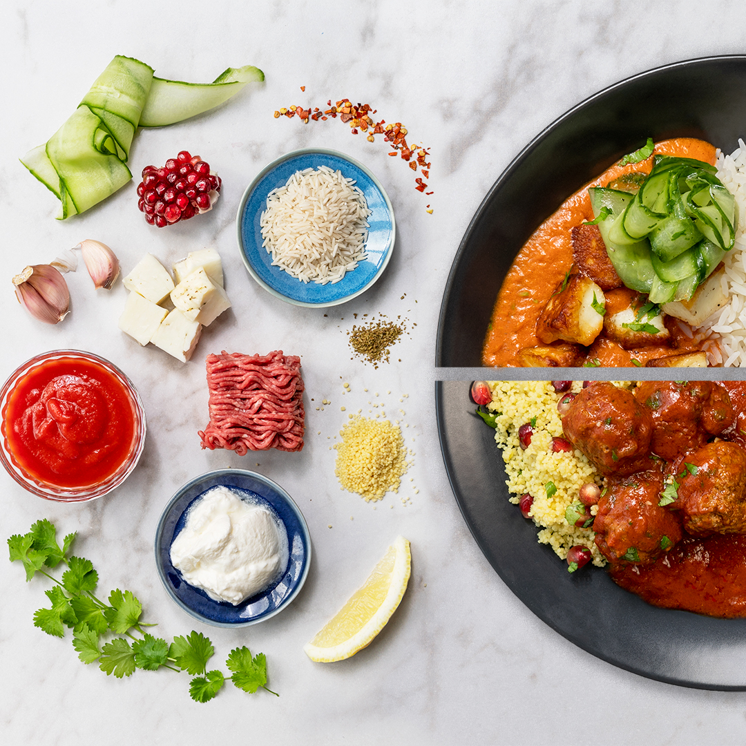 Indiska köttbullar i kryddig tomatsås med couscous + Halloumistroganoff med syrlig gurksallad