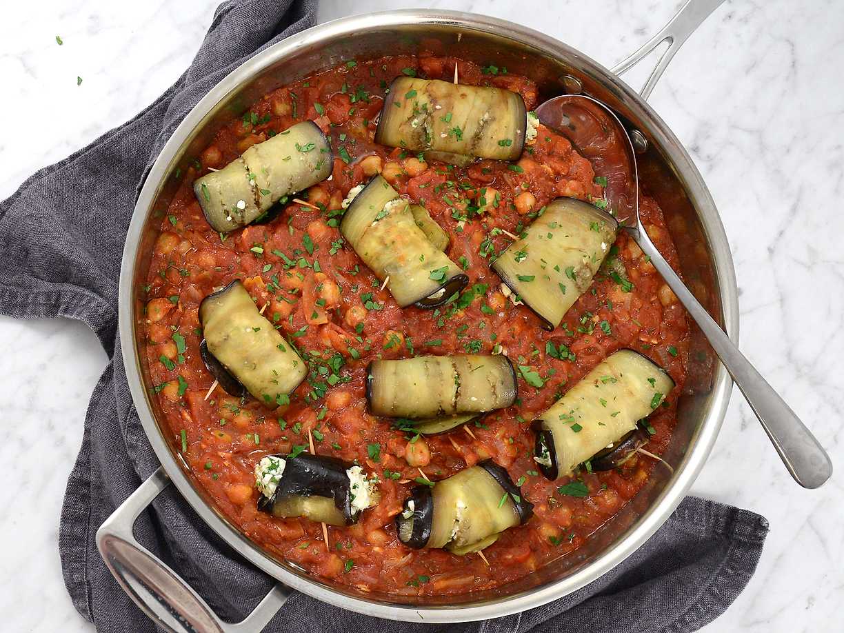 Auberginerullar med fetaost i tomatsås och sallad