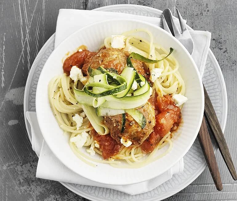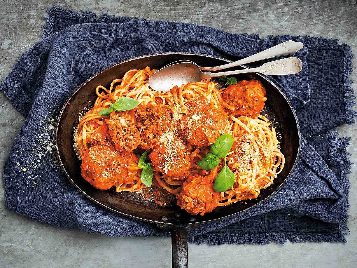 Vegobullar med linguinipasta och tomatsås