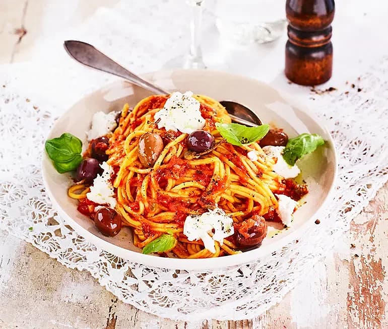 Pasta med tomatsås, oliver och sardeller