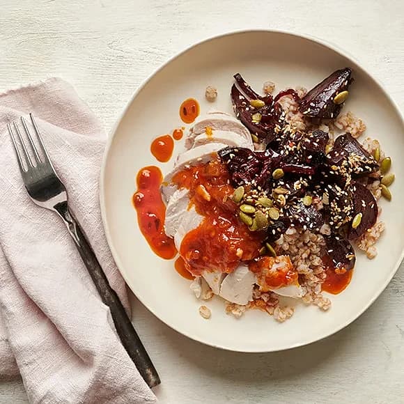 Kyckling med ugnsrostade rödbetor, matvete, tomatsås och frömix
