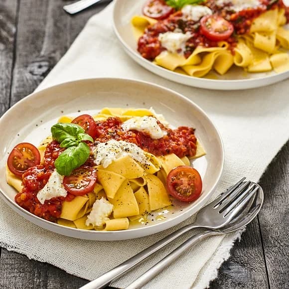 Pasta chitarra i tomatsås med mozzarella