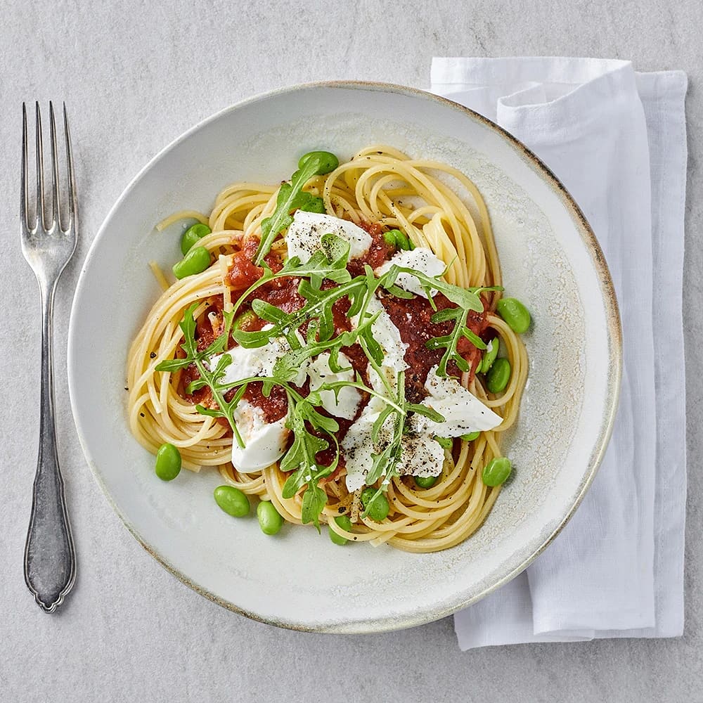 Spaghetti med het tomatsås och stracciatella
