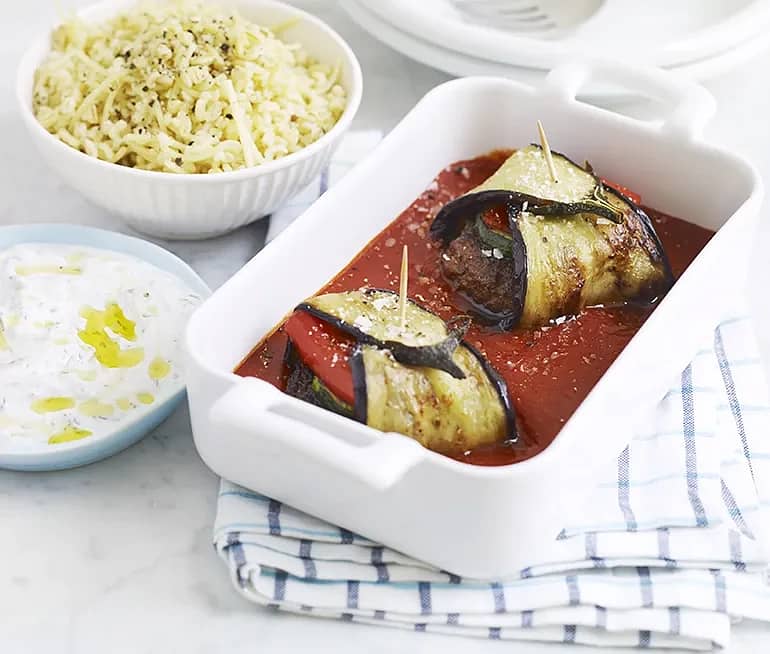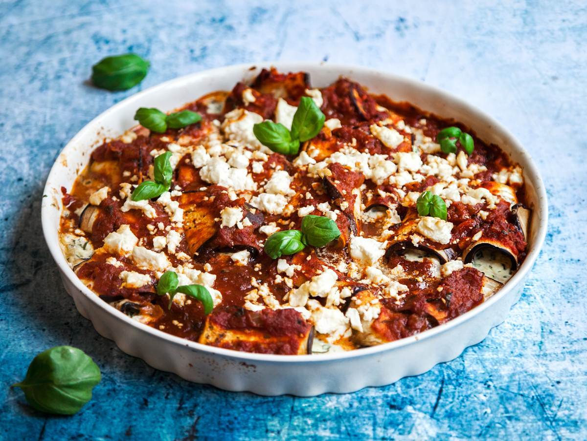 Fetaostfyllda auberginerullar i rökig tomatsås