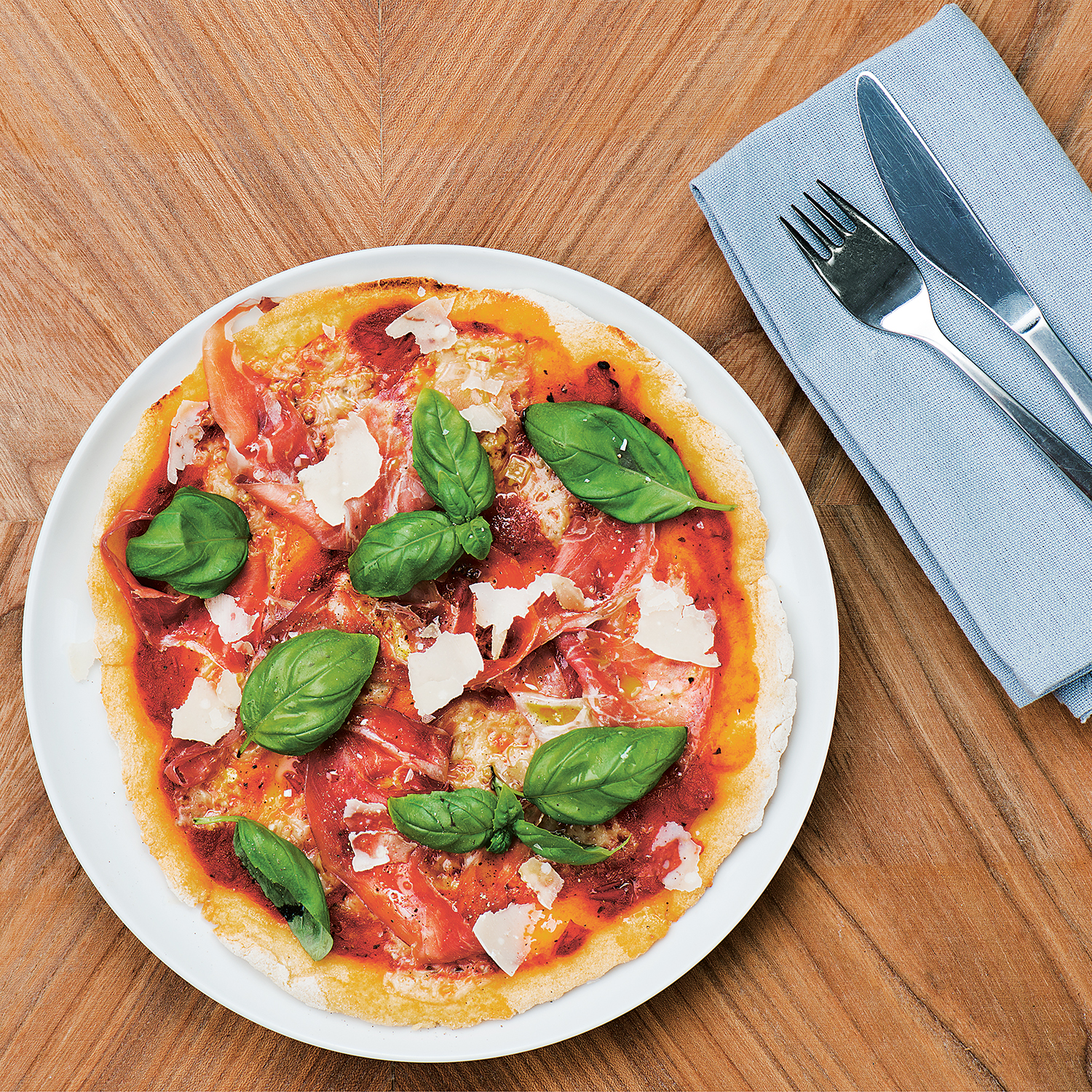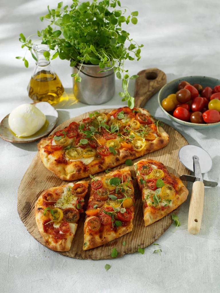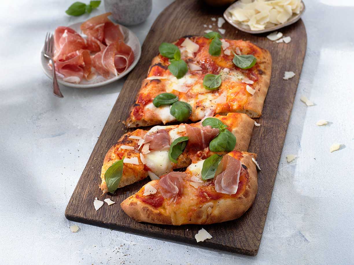 Pinsa med tomatsås, mozzarella och prosciutto
