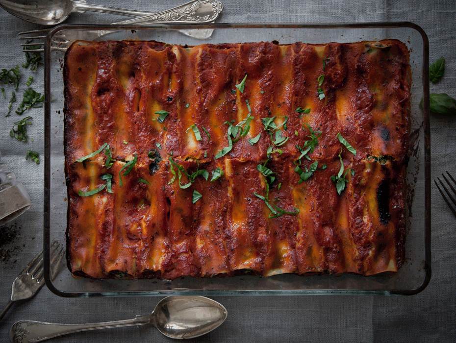 Rullad växtlasagne med örtig tomatsås och spenatpesto