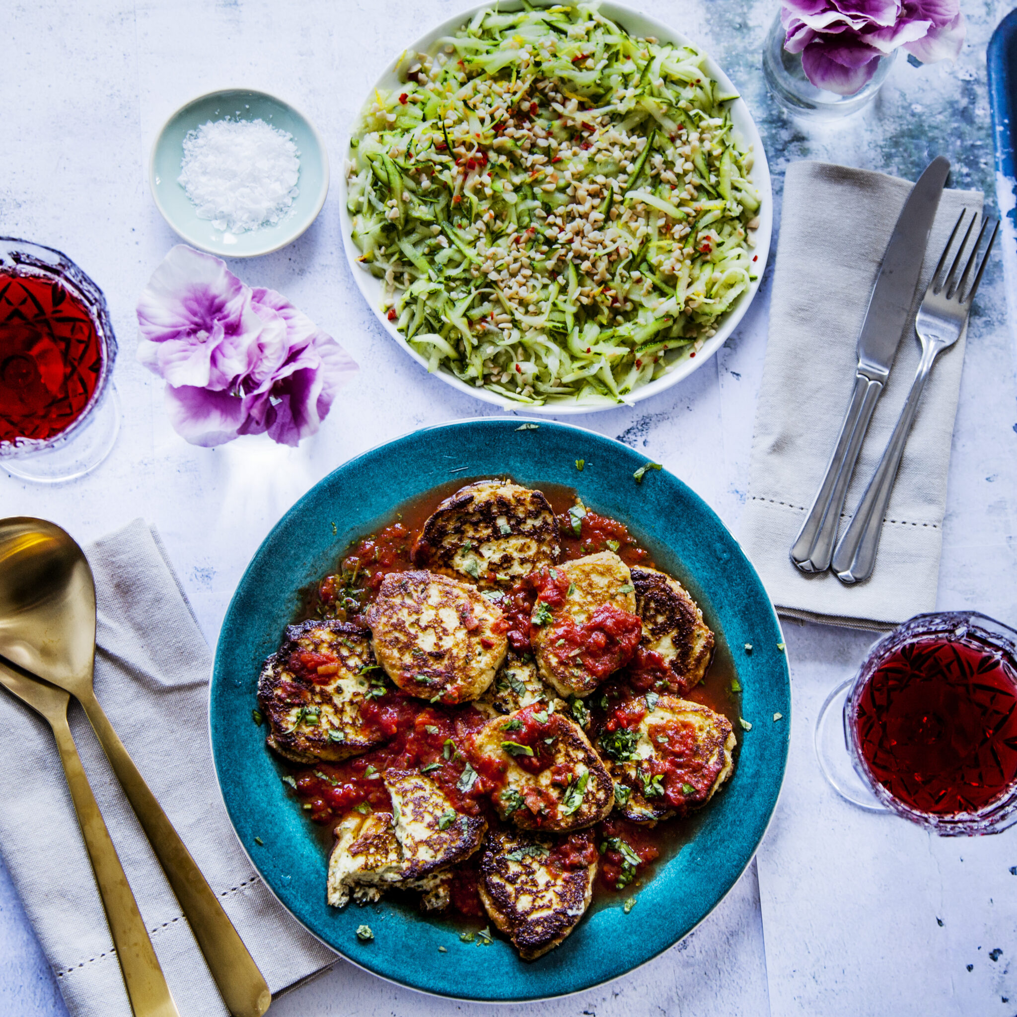 Ricottabiffar i tomatsås med zucchinisallad