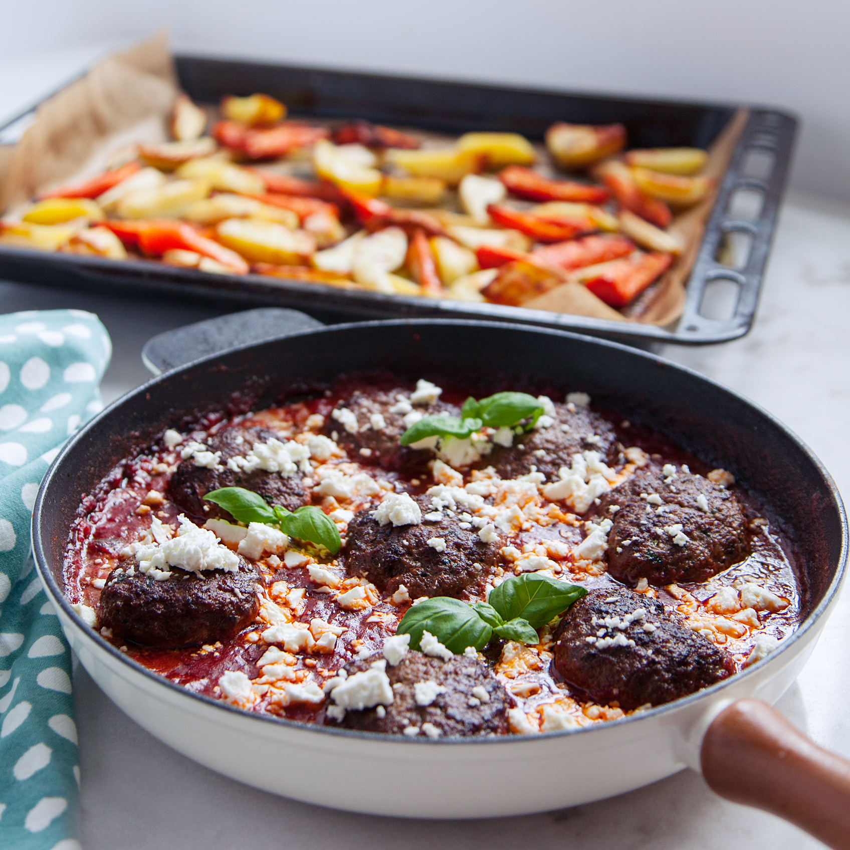 Italienska köttbullar i tomatsås med basilikarostad potatis