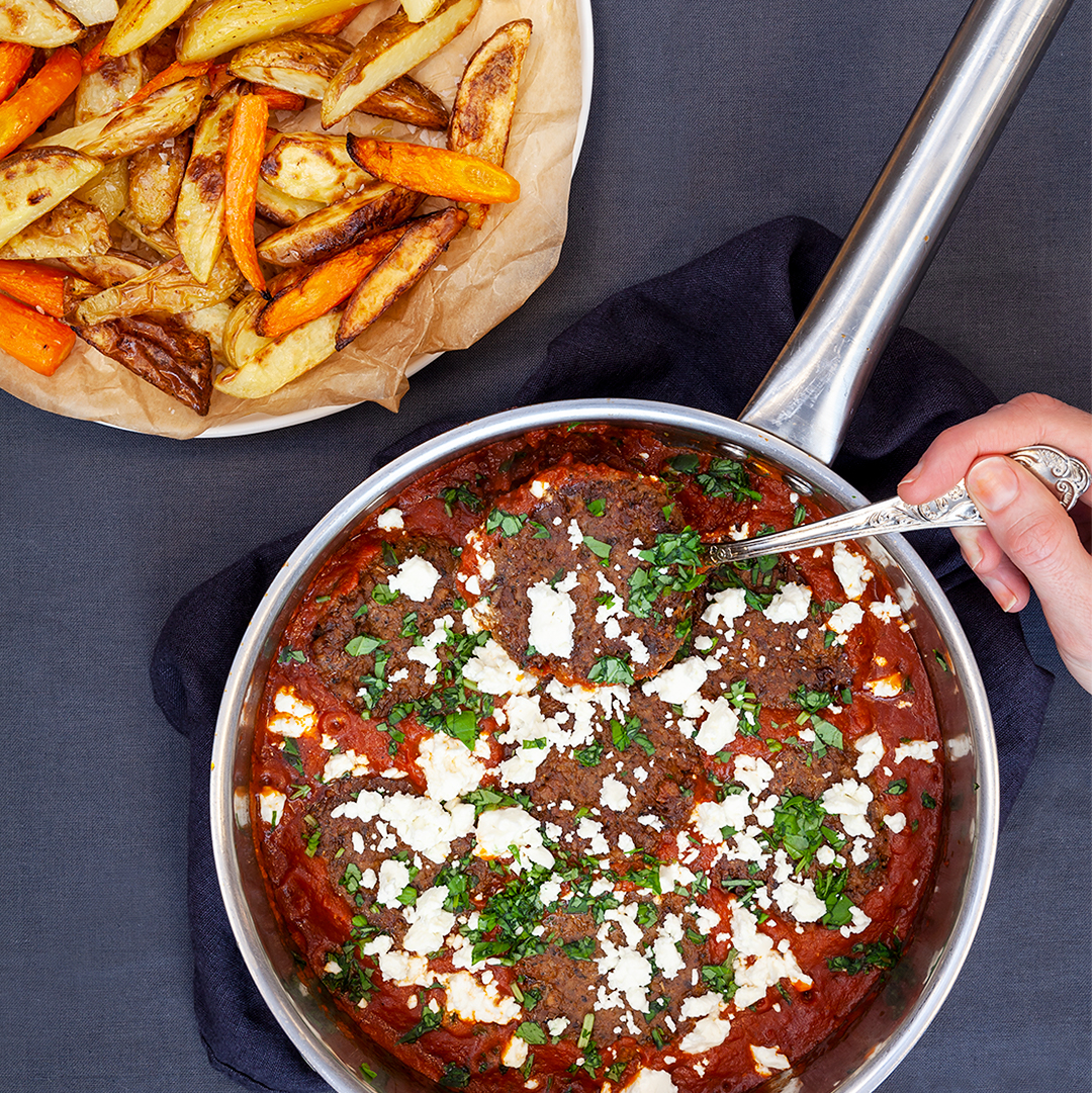 Grekiska vegobiffar i tomatsås med fetaostsmul