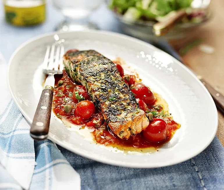 Persiljestekt lax med kapris- och tomatsås