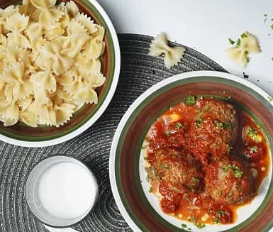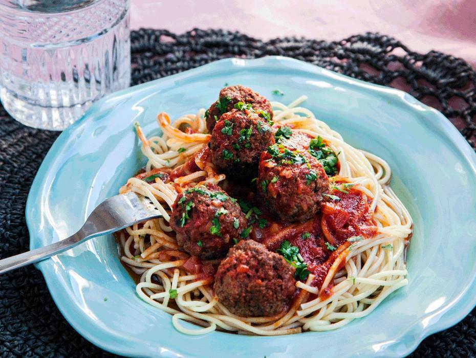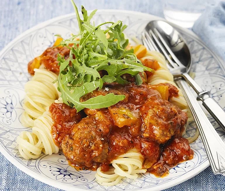 Köttfärsbollar i mumsig tomatsås och pasta