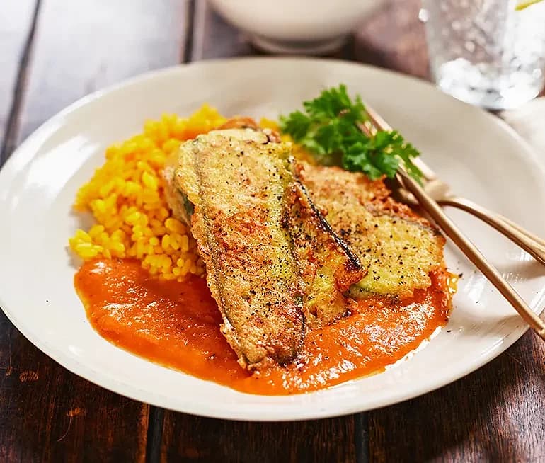 Halloumipanerad kycklingfilé med basilikarisotto och tomatsås