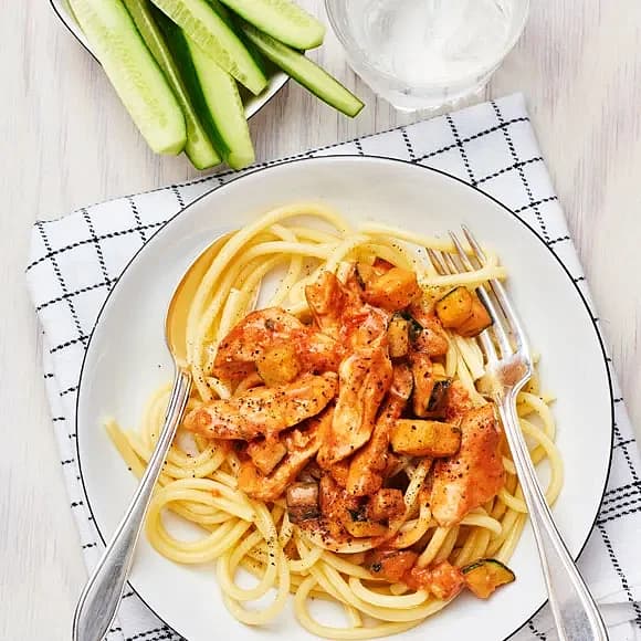 Bucatini med kyckling och tomatsås