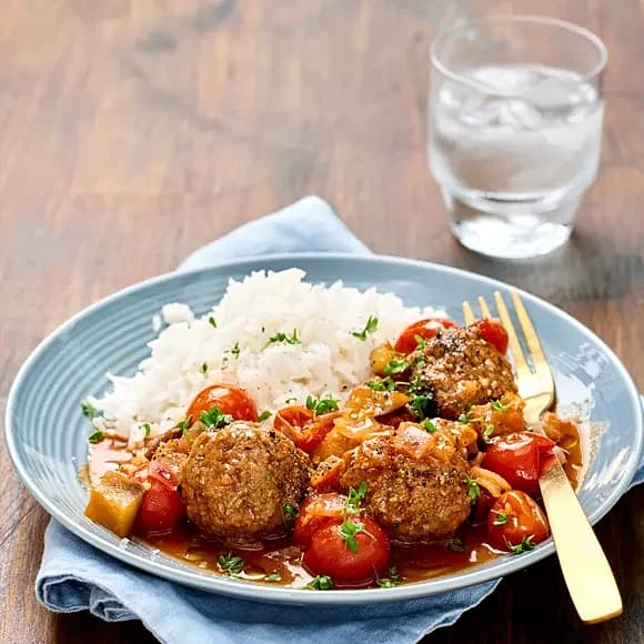 Kycklingfrikadeller i tomatsås med ris