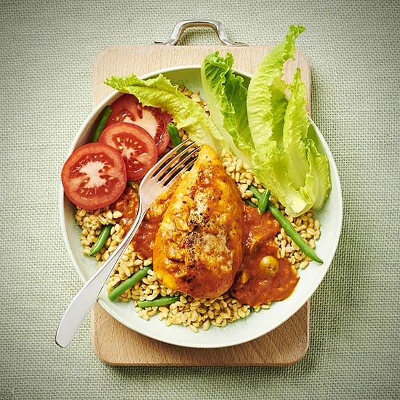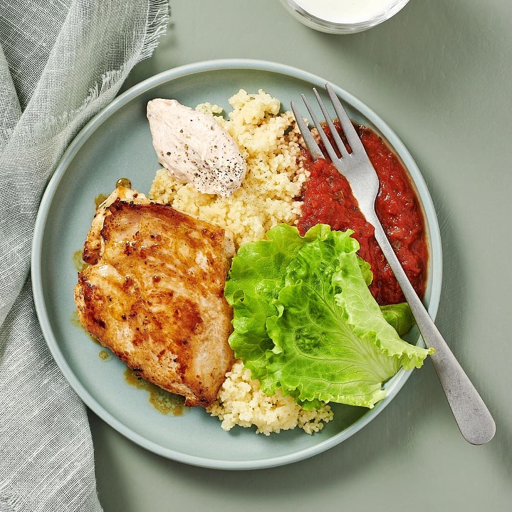 Kyckling med tomatsås och kryddig yoghurt