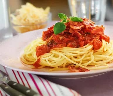 Pasta med bacon- och tomatsås