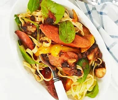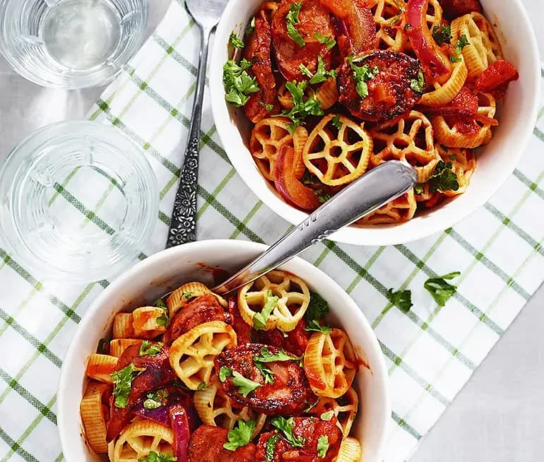Pasta och tomatsås med chorizo