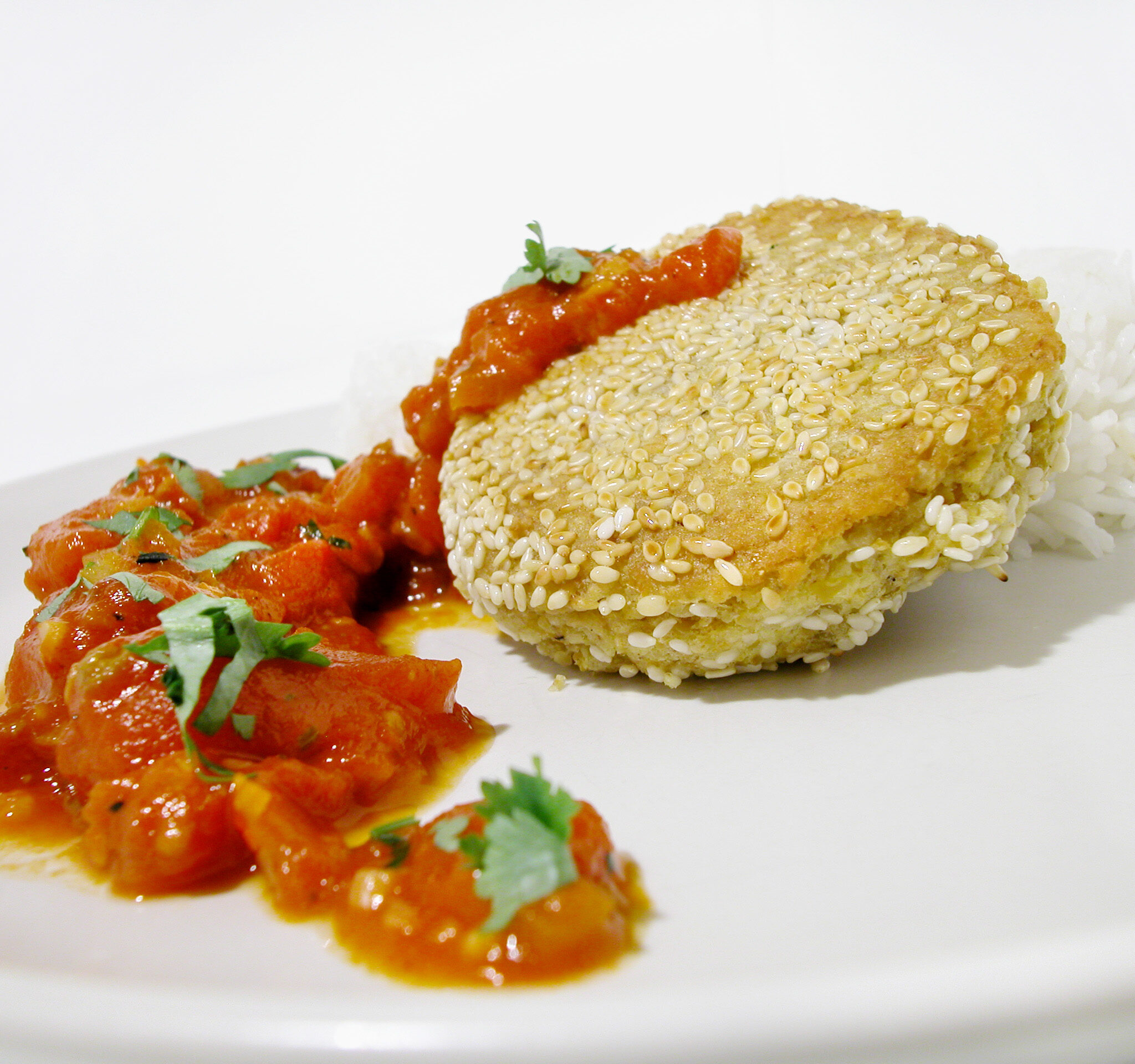 Kikärtsbiffar med korianderkryddad tomatsås och parboiled ris