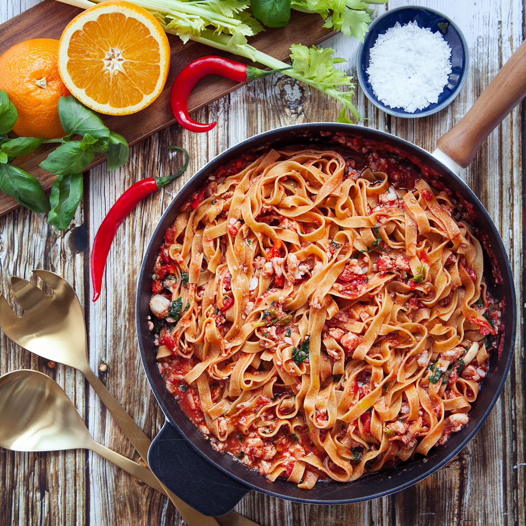 Chilitagliatelle al ́ ouvo med torsk i tomatsås