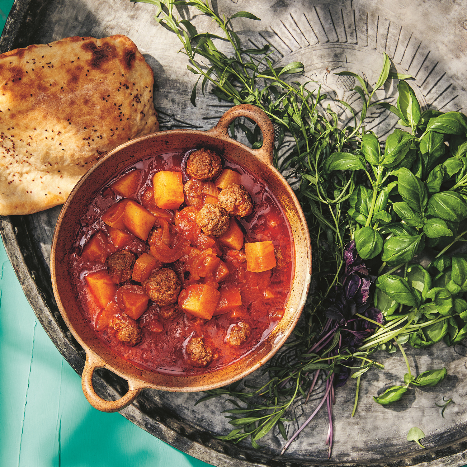 Örtkryddade köttfärsbiffar med rostade rotsaker och fetaost- och tomatsås