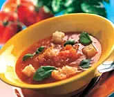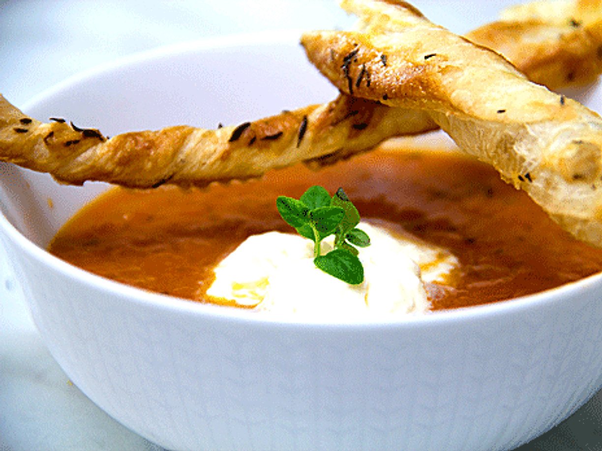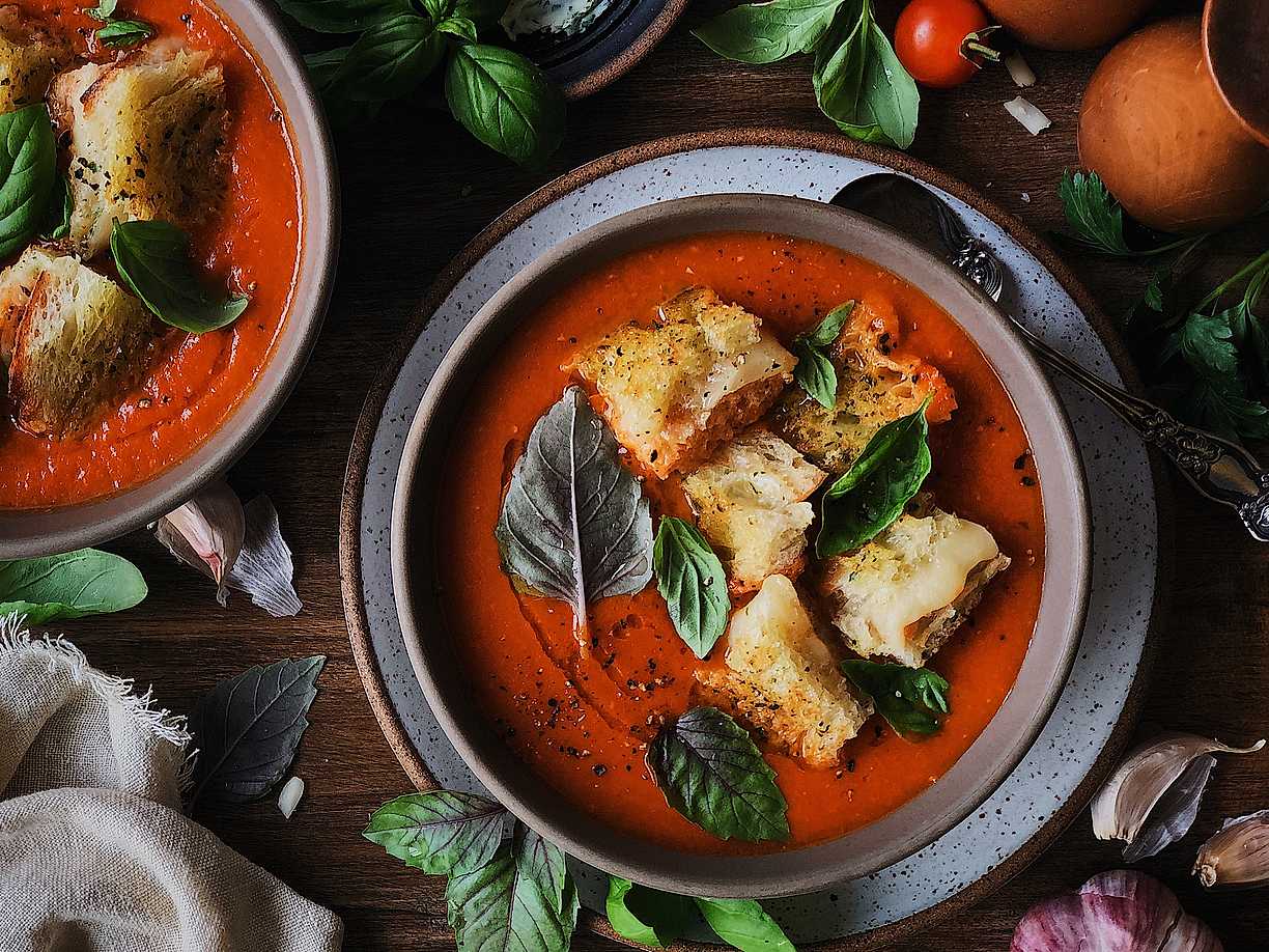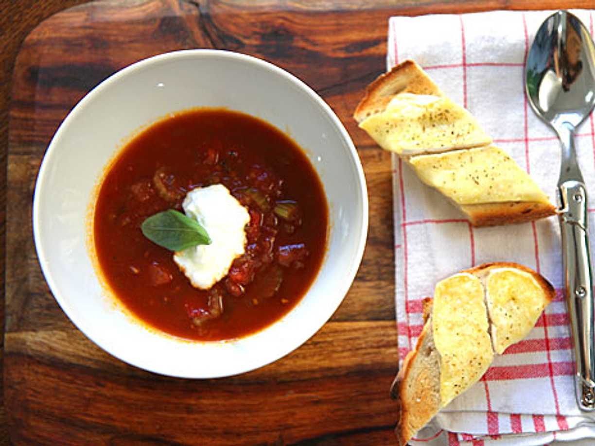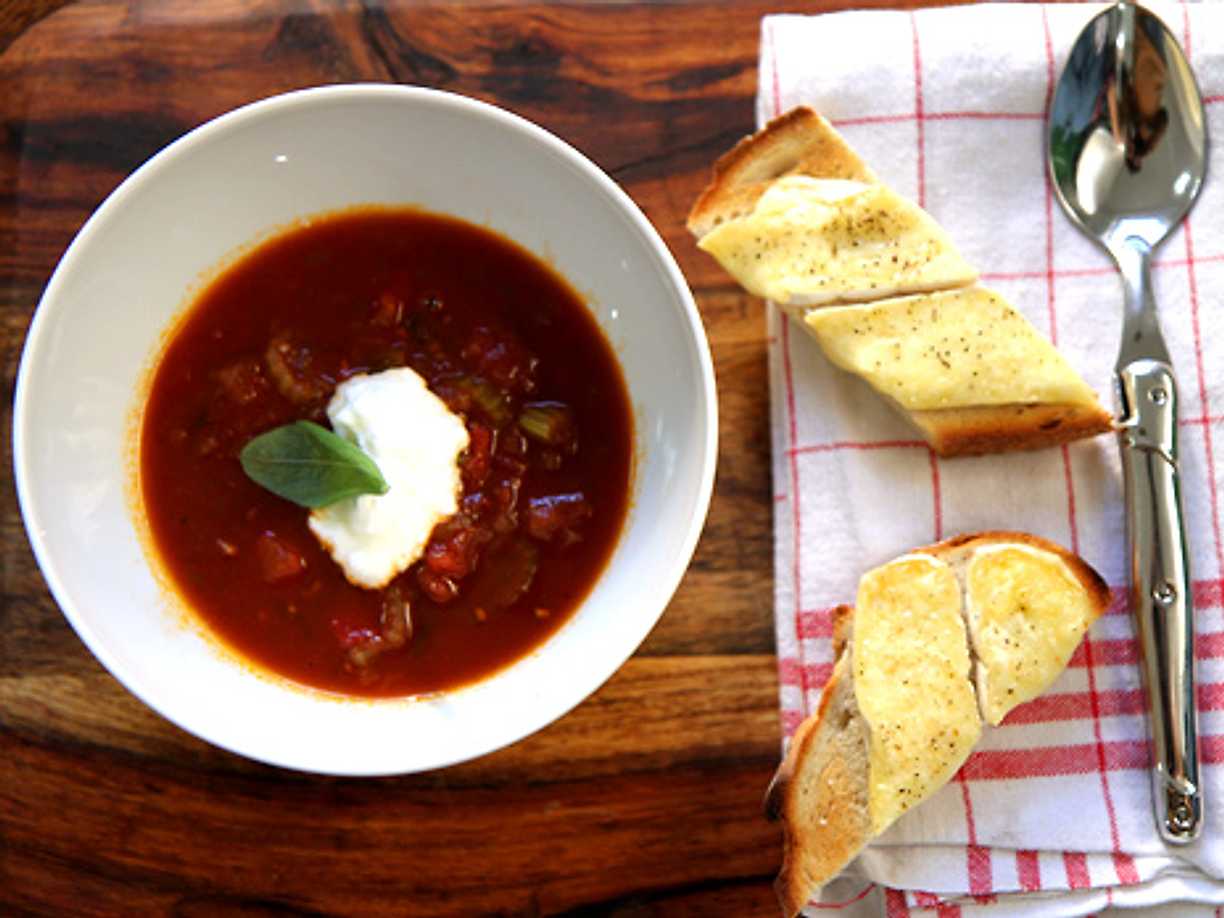 Tomatsoppa med ostgratinerat vitlöksbröd