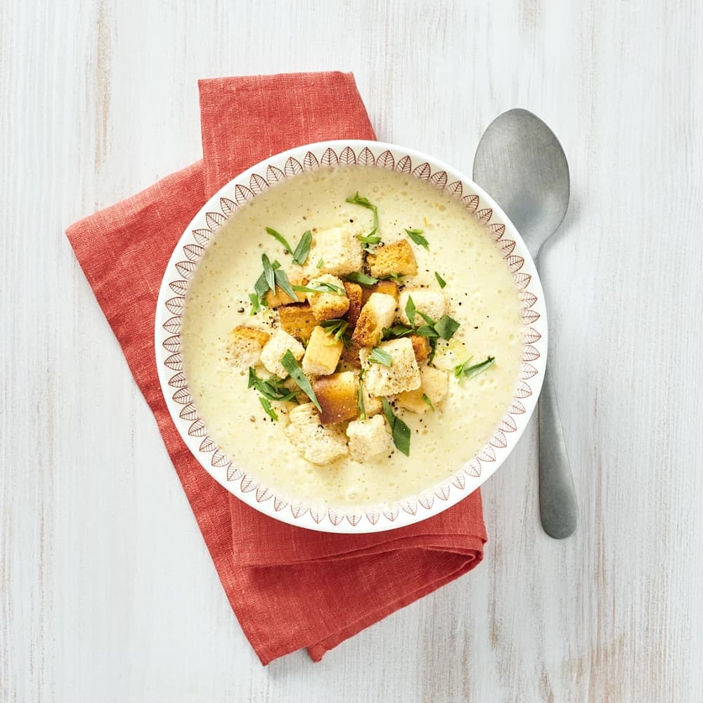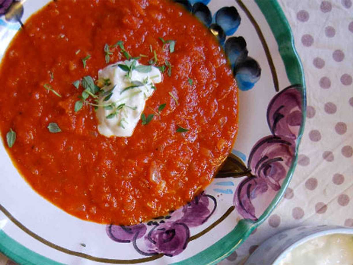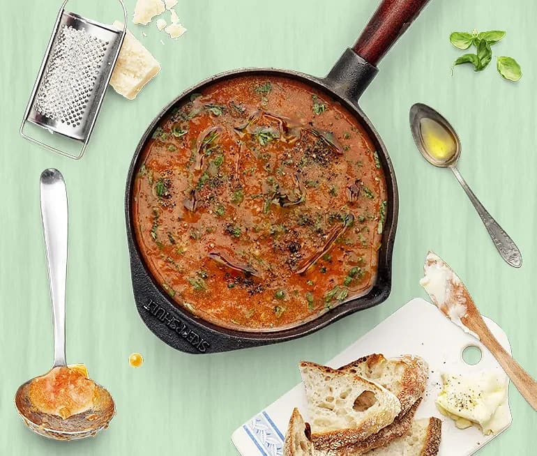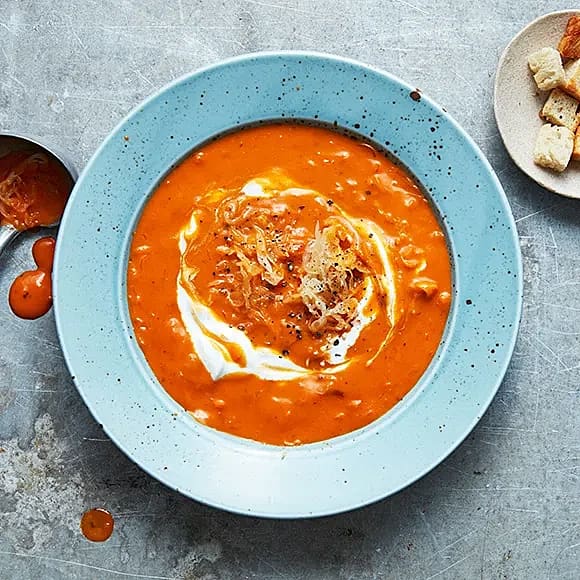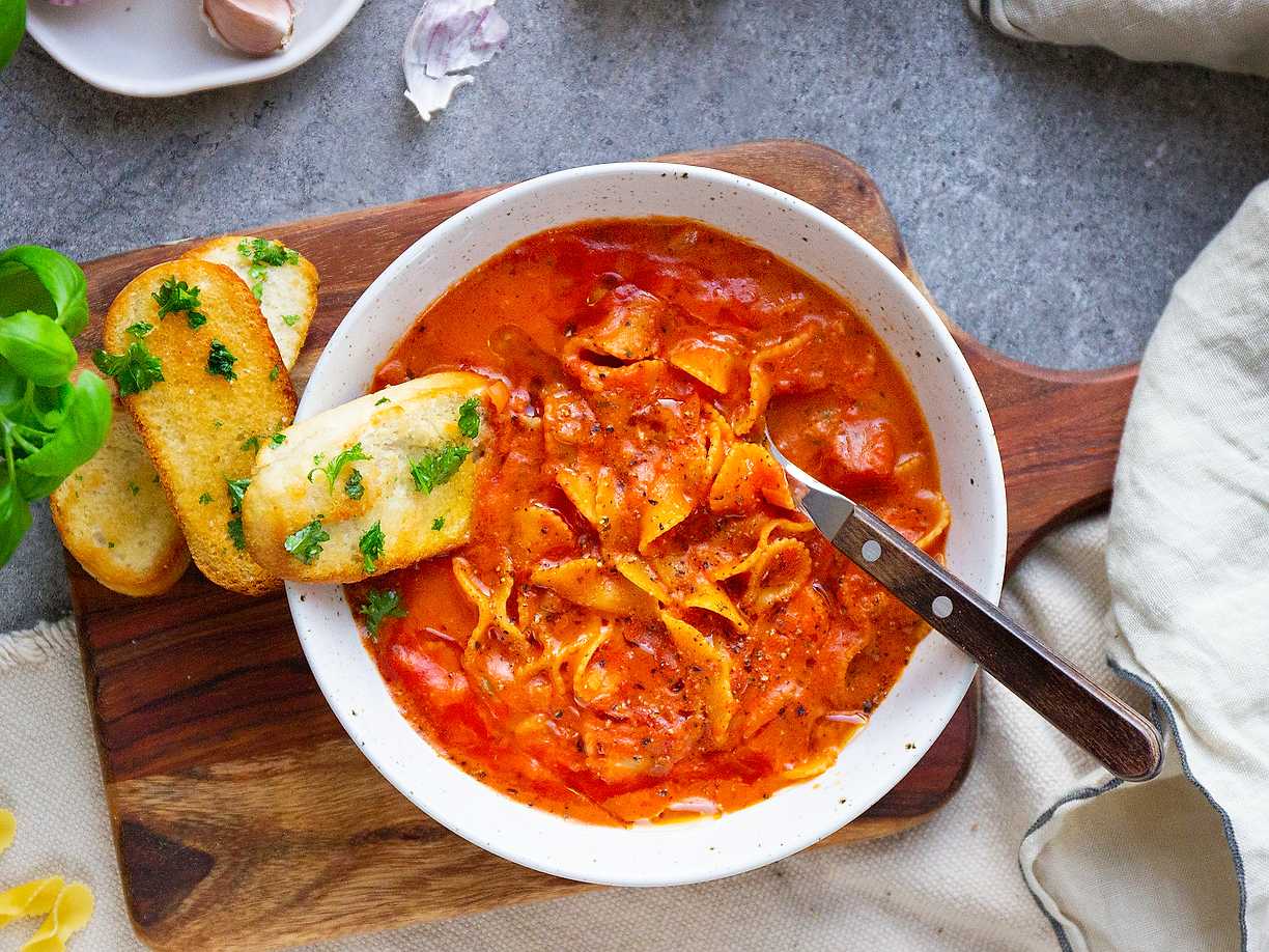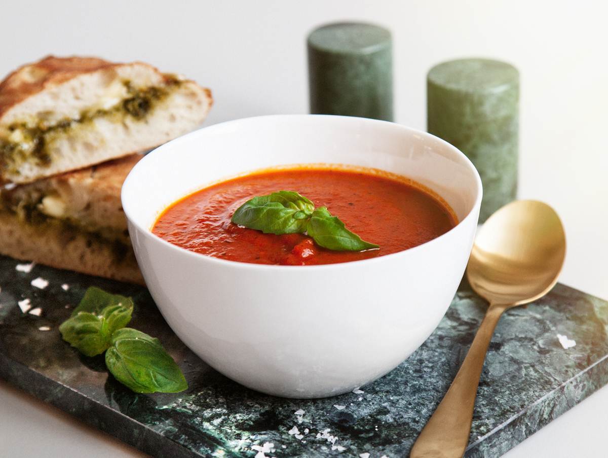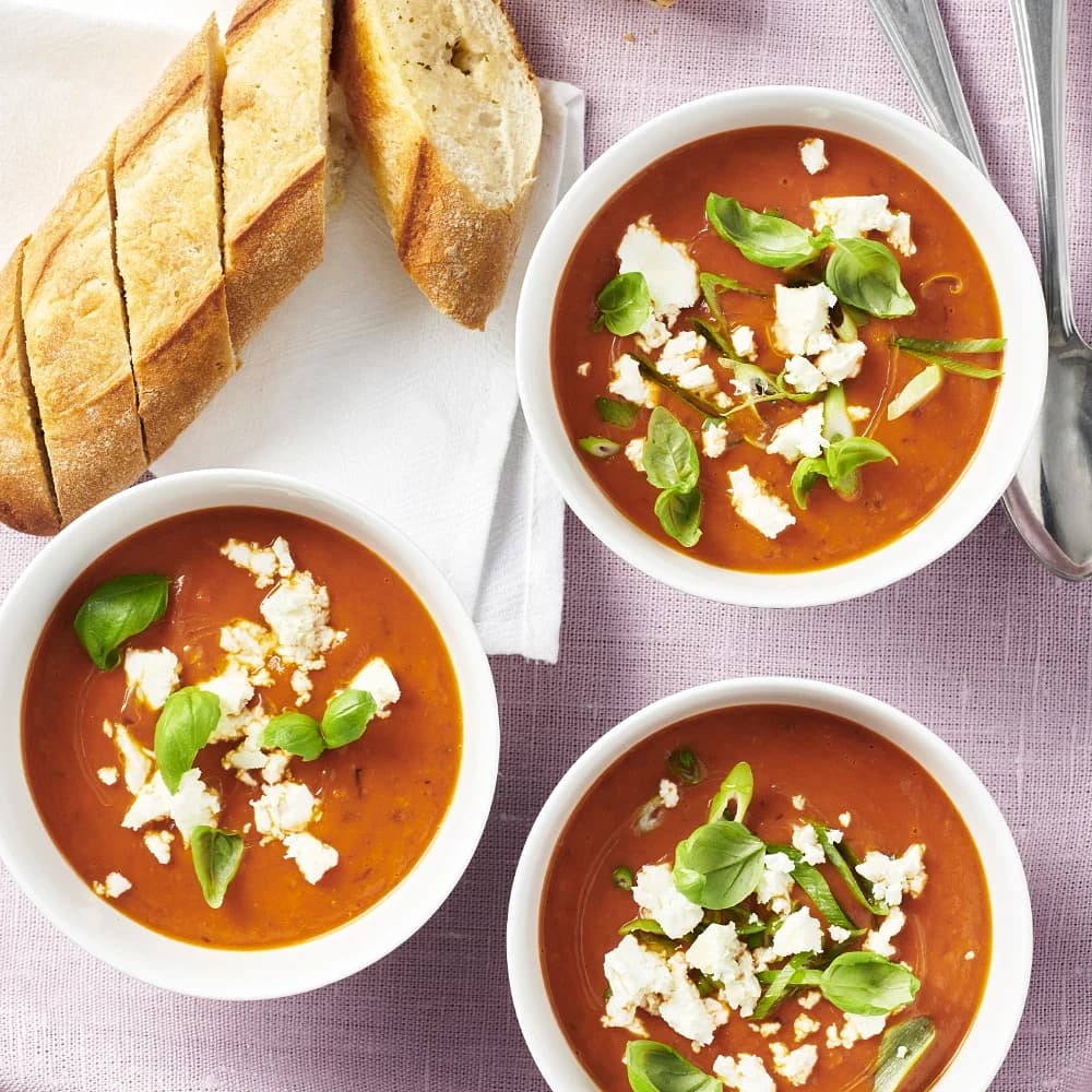 Krämig tomatsoppa med fetaost och vitlöksbröd