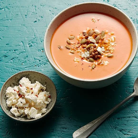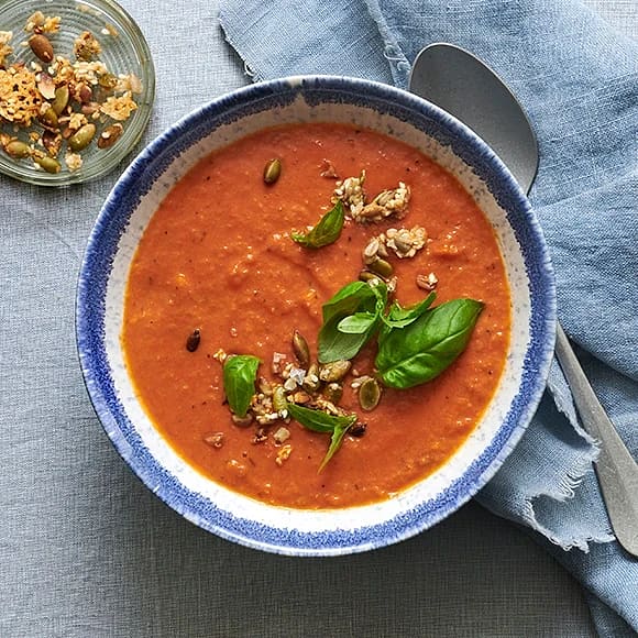 Tomatsoppa toppad med vitost, rostade nötter och färsk oregano